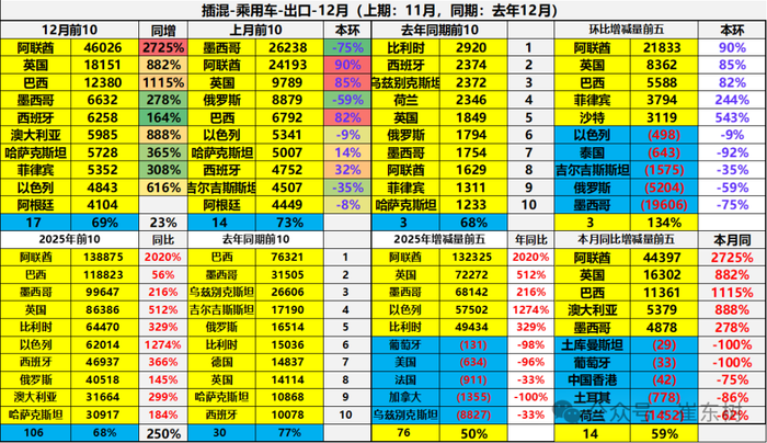 2025年12月出口插混乘用车的主要是阿联酋46026辆、英国18151辆、巴西12380辆、墨西哥6632辆、西班牙6258辆、澳大利亚5985辆、哈萨克斯坦5728辆、菲律宾5352辆、以色列4843辆、阿根廷4104辆,其中本期较同期增量增大的前五个是:阿联酋44397辆、英国16302辆、巴西11361辆、澳大利亚5379辆、墨西哥4878辆。