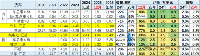 货车市场出口近几年增速不强,在汽车出口市场占比表现处于持续小幅萎缩状态,但2025年因纯电动和插混表现较强。