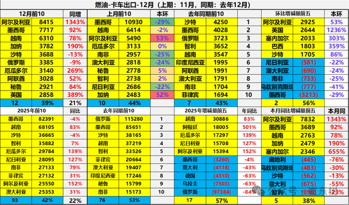 2025年全年燃油货车主力出口市场墨西哥82391辆、越南68105辆、沙特36665辆、智利35882辆、厄瓜多尔29784辆、尼日利亚28095辆、南非27133辆、菲律宾27132辆、阿尔及利亚25550辆、澳大利亚25353辆,其中今年较去年同期增量增大的前五个是:越南30886辆、阿根廷18005辆、厄瓜多尔17297辆、尼日利亚15708辆、阿尔及利亚15394辆。