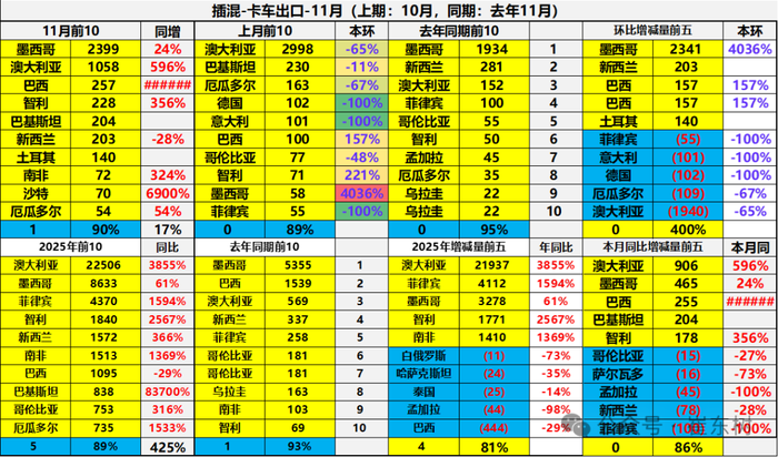 目前12月出口市场的墨西哥2399辆、澳大利亚1058辆、巴西257辆、智利228辆、巴基斯坦204辆、新西兰203辆、土耳其140辆、南非72辆、沙特70辆、厄瓜多尔54辆,其中本期较同期增量增大的前五个是:澳大利亚906辆、墨西哥465辆、巴西255辆、巴基斯坦204辆、智利178辆。