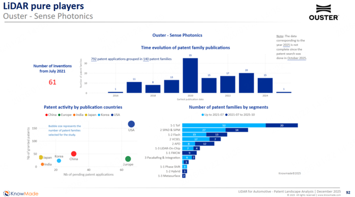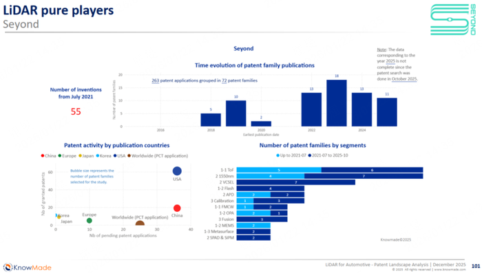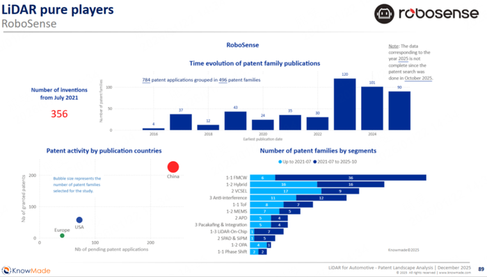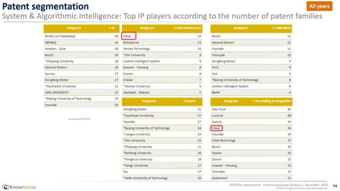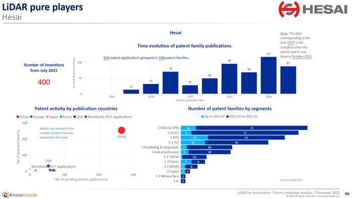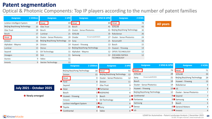 近日,Yole Group 旗下全球知名知识产权战略咨询机构 KnowMade 发布《汽车激光雷达专利全景分析 -2025 版》报告,(LiDAR for Automotive Patent Landscape Analysis 2025)。KnowMade 指出,禾赛在激光雷达领域的专利数量位居激光雷达行业全球第一,专利综合强度激光雷达行业全球第一、与博世、Waymo 位列全球前三,展现出其在激光雷达领域的持续创新能力与全球技术影响力。