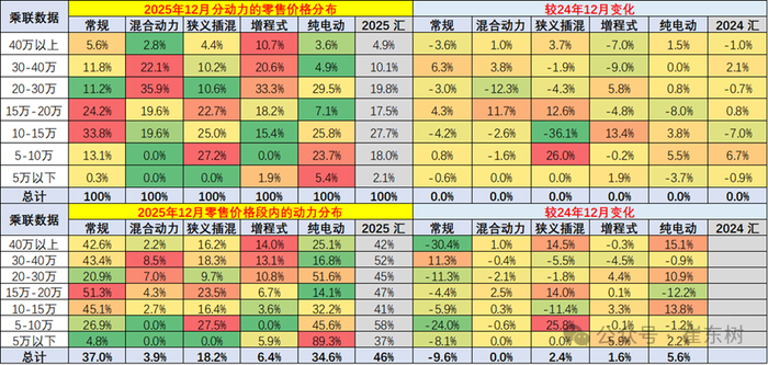 在价格段市场内,动力分布式相对是不均衡的。其中在5万元以下市场的纯电动表现最为强,而增程式电动车在高端市场表现分布相对是最强,而混合动力是在20-40万元市场份额稍高,在10-20万市场表现相对较强。