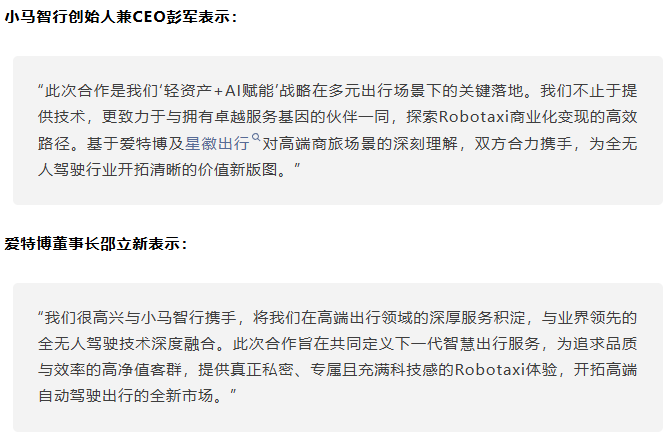 此次合作将深化自动驾驶在高端商旅场景的落地应用,重点聚焦机场接送服务。双方不仅将共同投入联合Robotaxi车队,小马智行自营车辆也将全面接入爱特博旗下星徽出行平台,构建“订单-运力-服务”的高效闭环,共同为航空旅客提供全程零等待、充满科技感的出行方案。
