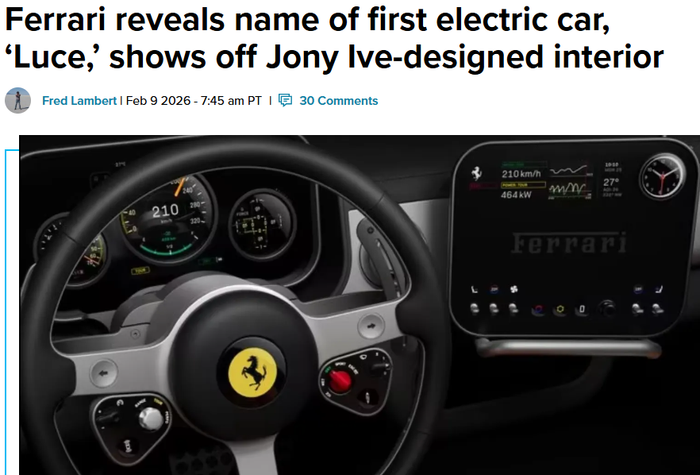 2月9日,据外媒报道,法拉利正式发布了旗下首款纯电动车型:法拉利Luce。“Luce”在意大利语中是“光”的意思,法拉利表示,这个名字代表着“电气化是一种手段,而不是目的”。