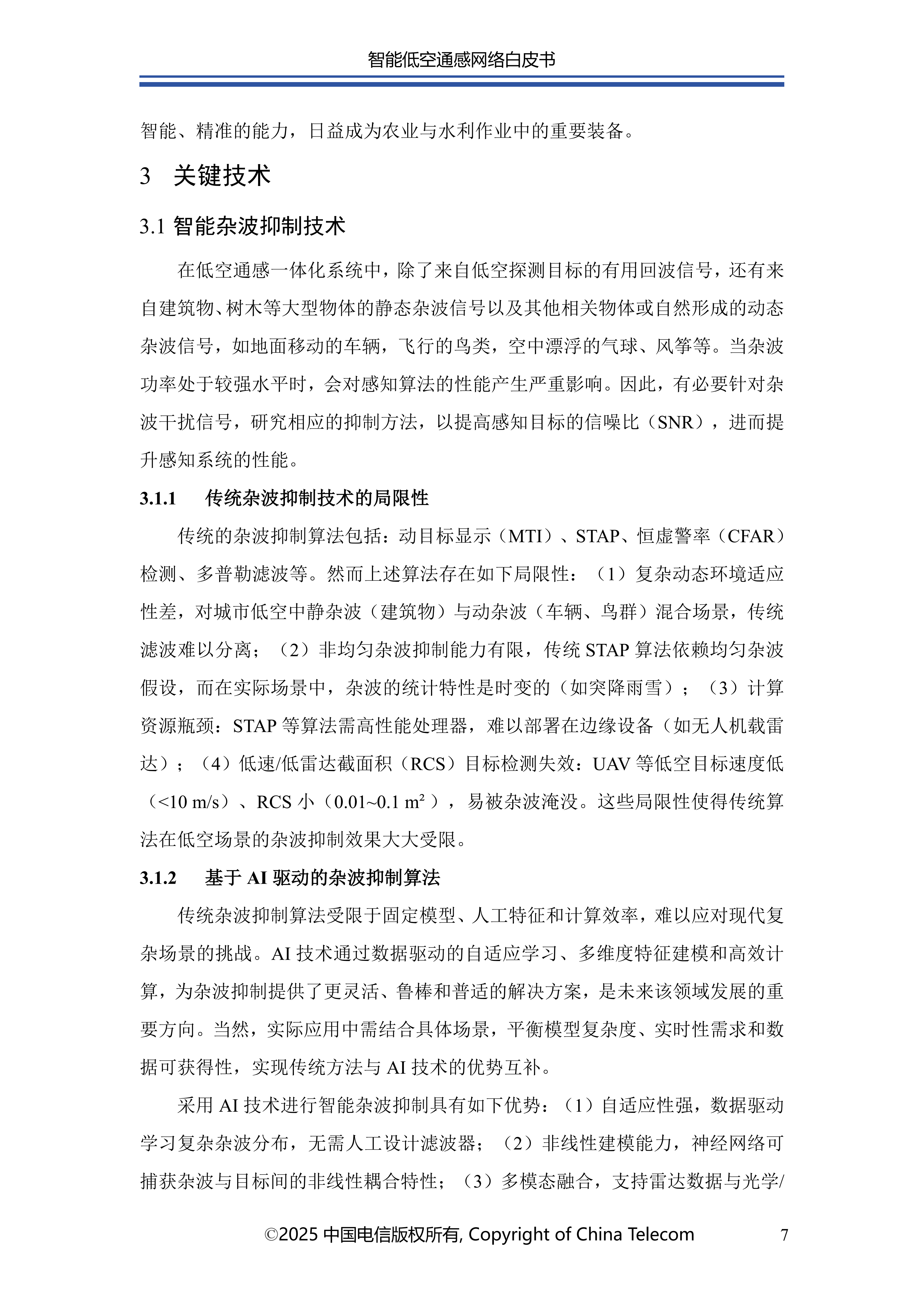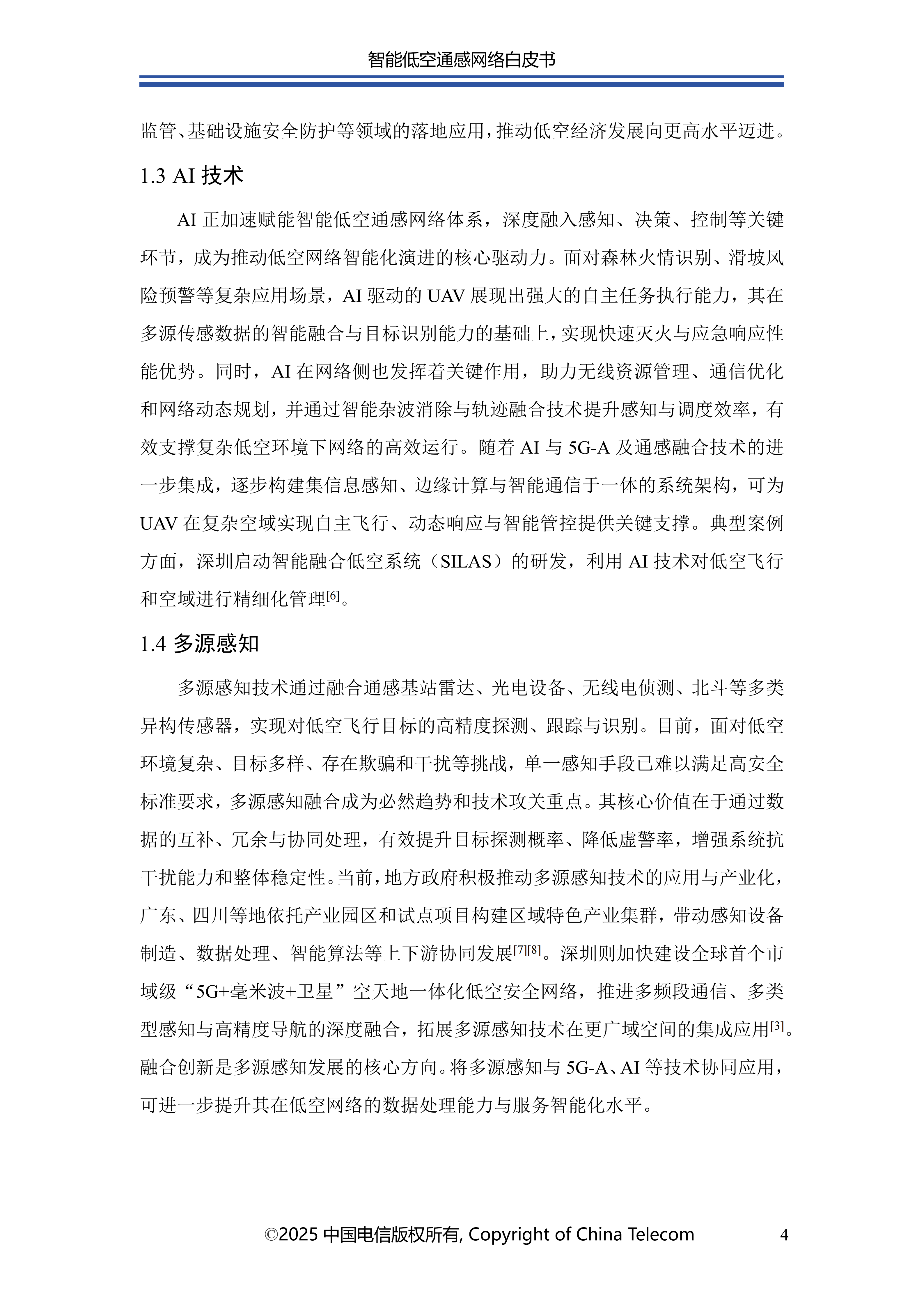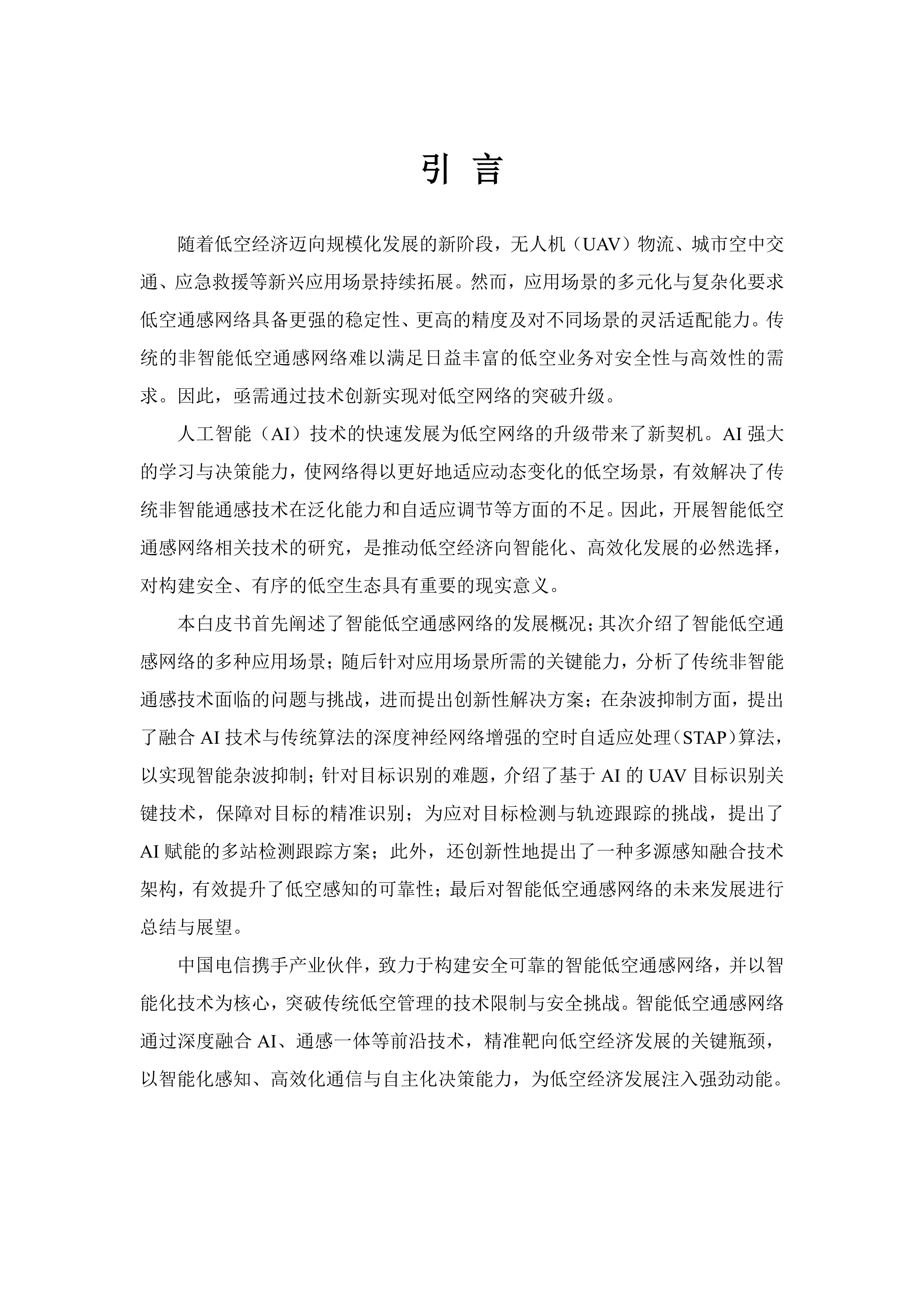 本白皮书首先阐述了智能低空通感网络的发展概况;其次介绍了智能低空通感网络的多种应用场景;随后针对应用场景所需的关键能力,分析了传统非智能通感技术面临的问题与挑战,进而提出创新性解决方案;在杂波抑制方面,提出了融合AI技术与传统算法的深度神经网络增强的空时自适应处理(STAP)算法,以实现智能杂波抑制;针对目标识别的难题,介绍了基于AI的UAV目标识别关键技术,保障对目标的精准识别;为应对目标检测与轨迹跟踪的挑战,提出了AI赋能的多站检测跟踪方案;此外,还创新性地提出了一种多源感知融合技术架构,有效提升了低空感知的可靠性;最后对智能低空通感网络的未来发展进行总结与展望。