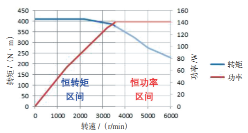 以某车型为例:在0~3500r/min的恒转矩区内,电机转矩保持400N·m,功率随转速近似线性上升至约140kW。当转速超过3500r/min后,电机进入恒功率区,输出功率稳定在约145kW,而转矩严格遵循T=Pmax/ω的双曲线规律随转速升高而下降。该特性转折点(3500r/min)标志着弱磁控制的介入:在此点附近转矩短暂抬升至约409N·m,功率同步达到峰值。
