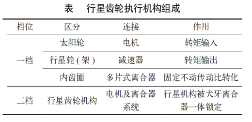后桥驱动模块将电机、两档变速器与控制器高度集成。其P3电机峰值功率175kW,峰值转矩约400N·m。其核心创新在于双速变速器结构,融合平行轴与行星齿轮结构优势,如图4所示。一档大传动比用于起步和强加速,二档小传动比用于高速巡航,各齿轮作用见表所示。