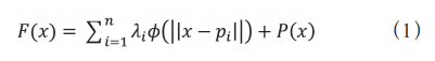 构建曲面的方法是拟合,常用的方法有多元二次响应面模型、插值型拟合和机器学习拟合。本文采用 插值型拟合的方法,该方法基于邻近数据点的相似性 插值生成连续曲面,适合 PHW、PCtrlBase 采样点密集的 场景,曲面平滑无断裂,便于后续用优化算法查找最 优 PCtrlBase。具体的插值方法可以用三次插值 ( 基于三 次多项式拟合局部数据 ),也可以用克里金插值 ( 基于 空间相关性建模,假设邻近的 (PHW、PCtrlBase) 对应的 GMUTS 更相似,通过变异函数(如高斯函数、球面函 数)量化相关性,拟合出平滑且高精度的曲面 )。本文采用径向基函数插值(RBF),以每个数据点为中心构建径向基函数(如高斯核、多二次核),通过加权求和生成曲面,适合非线性强、数据分布不均的场景。插值函数如式 (1) 所示。