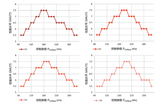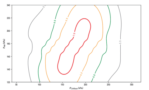 将图 3 与图 4 结合起来,便可以计算出在当前硬件特征分布特性下,使整车性能最大化的最优 PCtrlBase值。如图5 所示,一般情况下,我们要求整车下线时的初始换档质量达到 GMUTS7.0,以此作为评估方法, 每一个 PCtrlBase 都可以对应查到可以满足 GMUTS7.0 的 硬件特征参数范围(A ,B),即当硬件特征参数处于该 范围内时,整车换档质量可以达到 7.0 以上。结合实际 的硬件特征参数分布,可以计算出实际处于该范围内 的车辆比例。基于最大化批量车辆的初始换档质量的 目标,最终选定了最优初值 PCtrlBase( 最优 )。