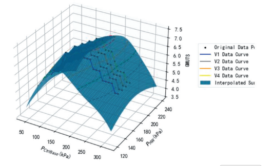 插值结果如图 2 所示,通过曲面拟合实现了 PHW、 PCtrlBase 和 GMUTS 的连续关系映射。