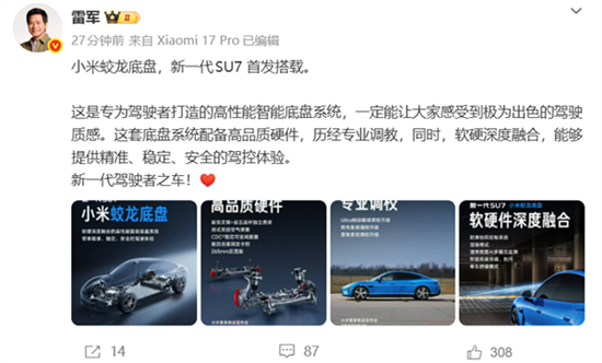 “这是专为驾驶者打造的高性能智能底盘系统,一定能让大家感受到极为出色的驾驶质感。这套底盘系统配备高品质硬件,历经专业调教,同时,软硬深度融合,能够提供精准、稳定、安全的驾控体验。”雷军表示。