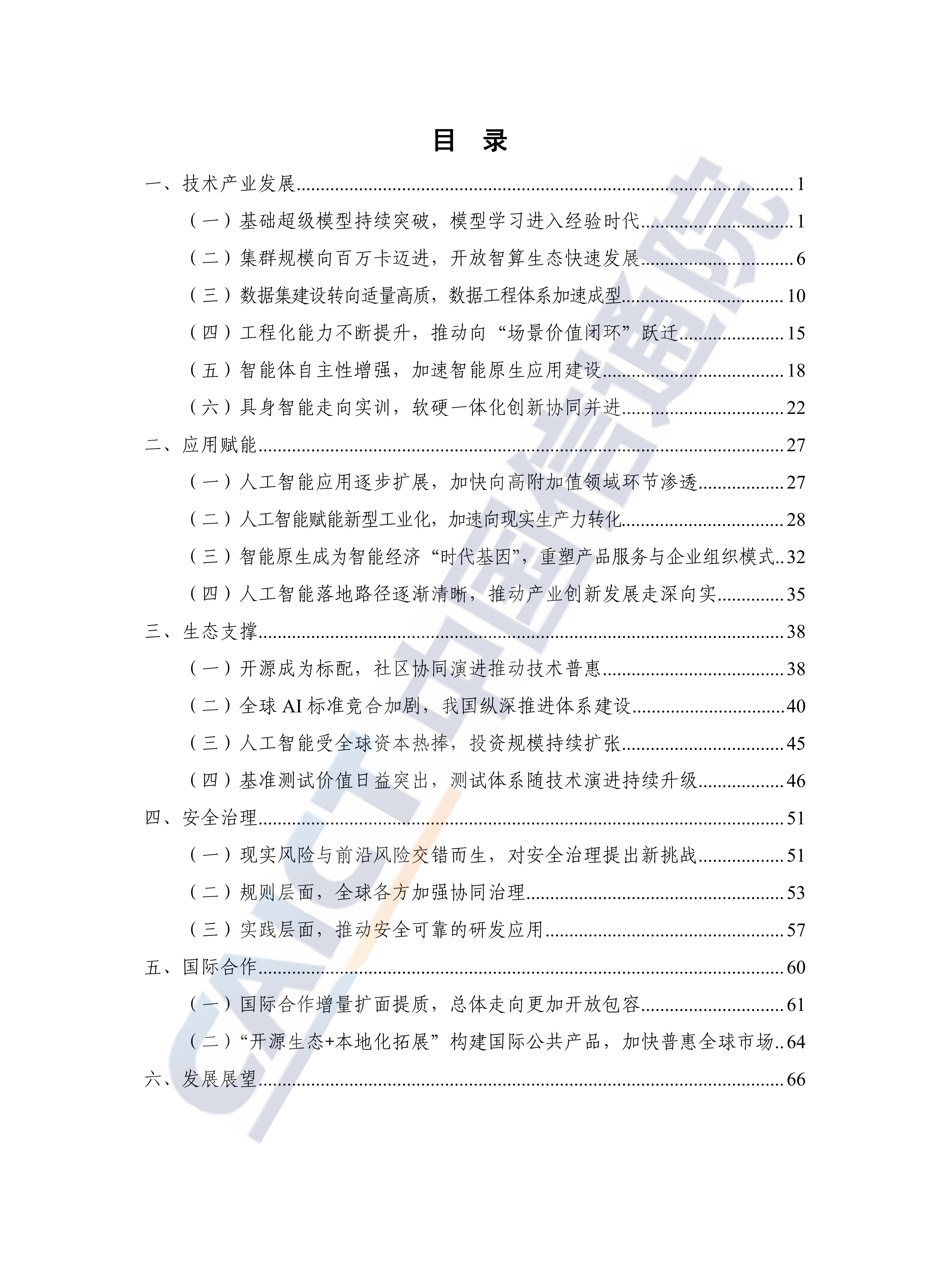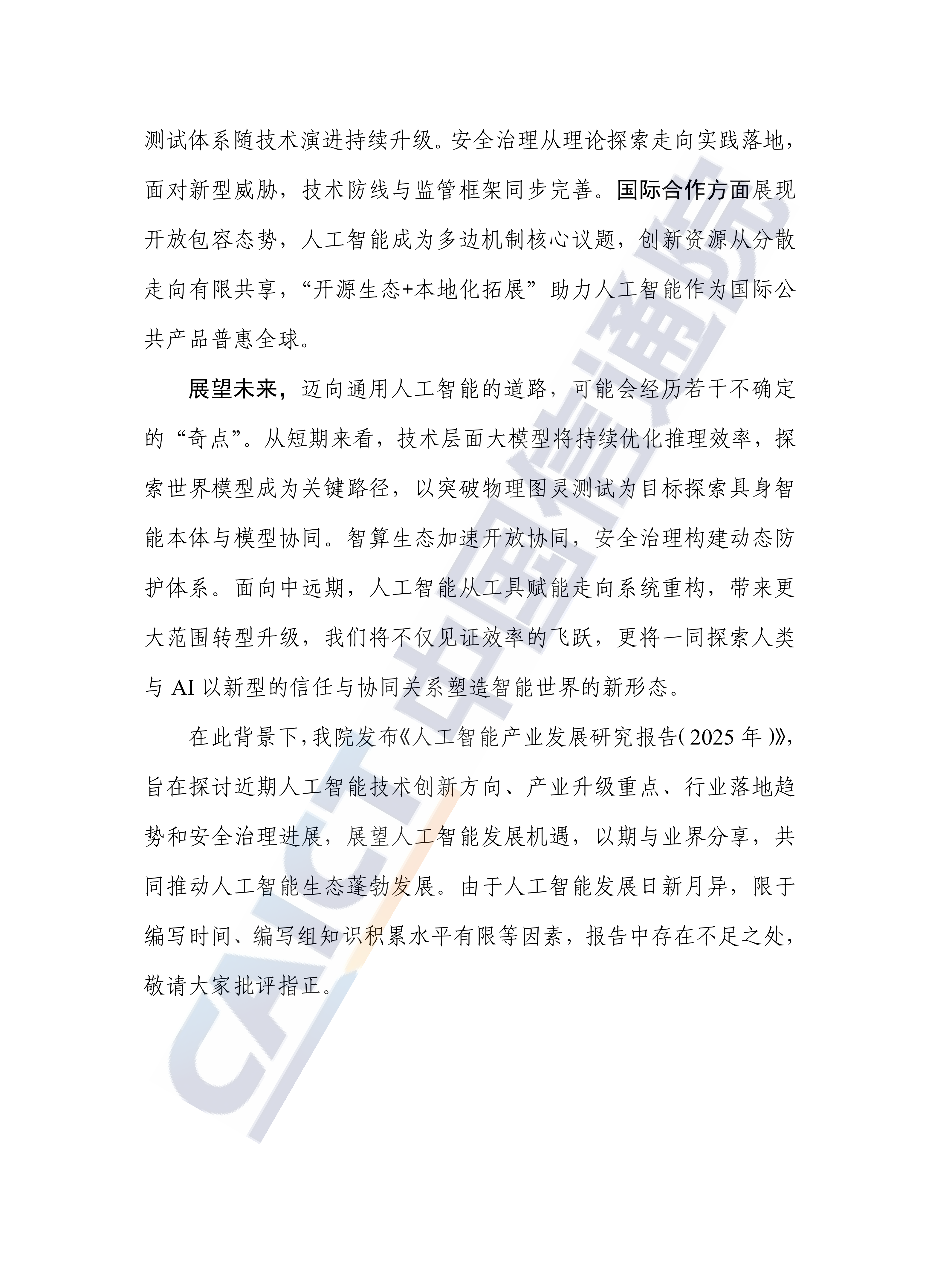 生态和治理方面,开源生态成为技术普惠的关键力量,全球AI标准竞争加剧,中国纵深推进体系建设,基准测试体系随技术演进持续升级。安全治理从理论探索走向实践落地,面对新型威胁,技术防线与监管框架同步完善。国际合作方面展现开放包容态势,人工智能成为多边机制核心议题,创新资源从分散走向有限共享,“开源生态+本地化拓展”助力人工智能作为国际公共产品普惠全球。