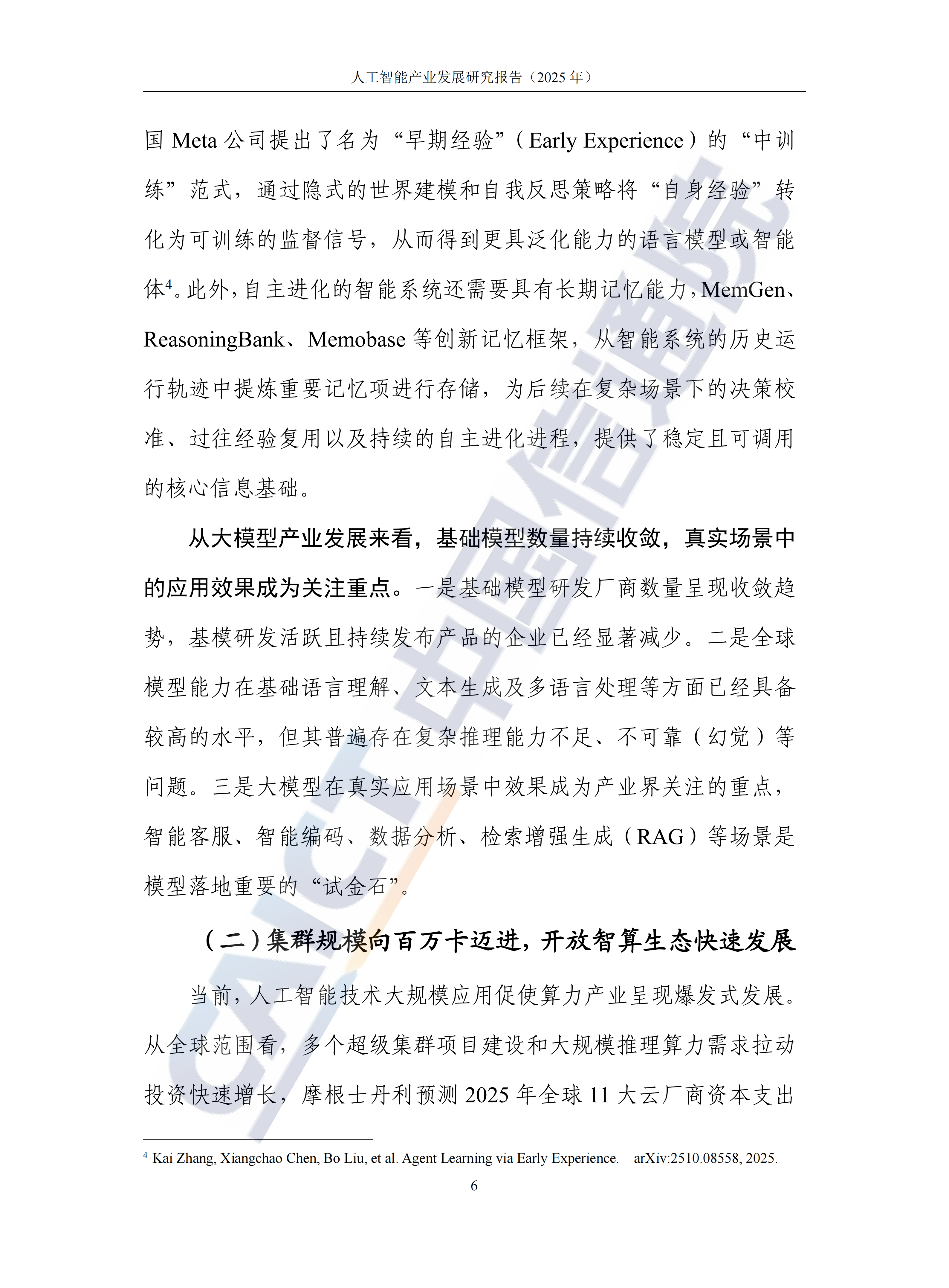 技术方面,基础超级模型在核心能力上实现全方位提升,强化学习推动模型在真实环境中持续进化,原生多模态架构逐渐走向成熟。高度封装的智能体产品加速模型从感知认知向自主决策执行演进。同时,智算基础设施进入“吉瓦级”竟争新阶段,开源开放的智算生态加速形成。数据工程从规模堆砌转向质量优先,为模型能力提供优质“燃料”。