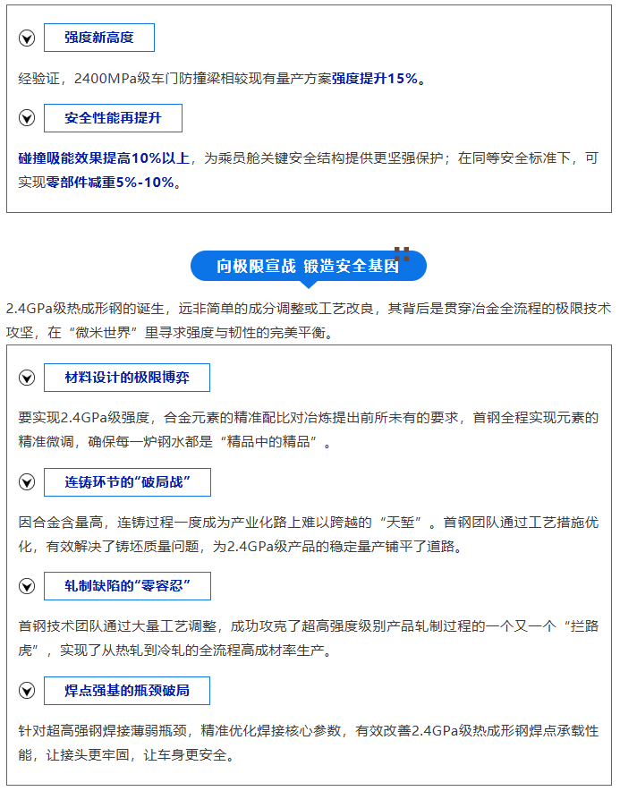 本次首钢与一汽联合开发的2.4GPa级热成形钢,在保持超高强度的同时,实现了材料韧性和抗氢脆性能的协同保障。相较于目前行业广泛应用的2.0GPa级别材料,新材料在以下方面实现显著突破:
