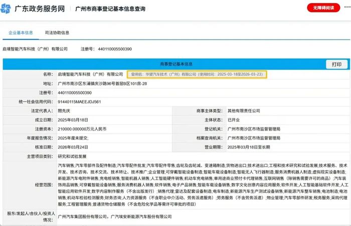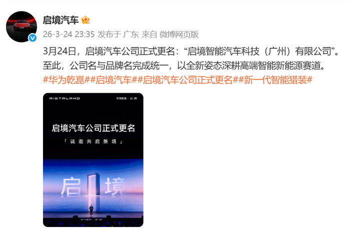 3月24日,华望汽车技术(广州)有限公司完成工商变更,公司正式更名为启境智能汽车科技(广州)有限公司,与启境汽车品牌名称完成统一。启境汽车是由华为乾崑和广汽集团联合打造新品牌,3月17日正式对外发布品牌及亮相首款车型启境GT7。此次更名标志启境从筹备阶段全面转向市场化运营。