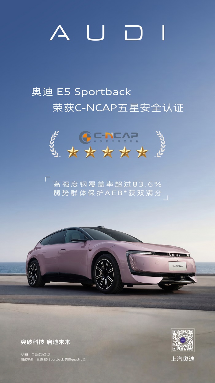 2026年3月27日,上海 – 近日,中汽中心汽车测评管理中心正式发布2026年度最新一批《中国新车评价规程(C-NCAP)》车型测评结果。奥迪 E5 Sportback凭借全面领先的整车安全架构与极致全域防护性能,以91.3%的综合得分率,荣获C-NCAP最高等级五星安全认证,充分彰显了其在豪华纯电市场标杆级的安全硬实力,更印证了奥迪的百年造车底蕴。