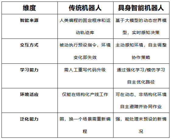 很多人混淆"具身智能"和"传统机器人",是因为二者都有物理实体。但它们的智能生成机制完全不同 :