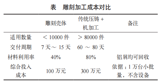 传统模具加工毛坯是异形壳体大批量生产的主流工艺,但在小批量、定制化的前景下,模具开发的周期及固定成本分摊极高,根据以往经验,传统模具加工制造周期60天左右,开发成本100万元左右(根据产品确定),一次性投入模具寿命8万元/套。小批量雕刻时,其单件成本对比传统加工可降低50%以上,投资后1.6年即可回收成本。同时雕刻壳体可一周内出产品,如图3所示。满足市场变化的开发需求。成本对比见表。