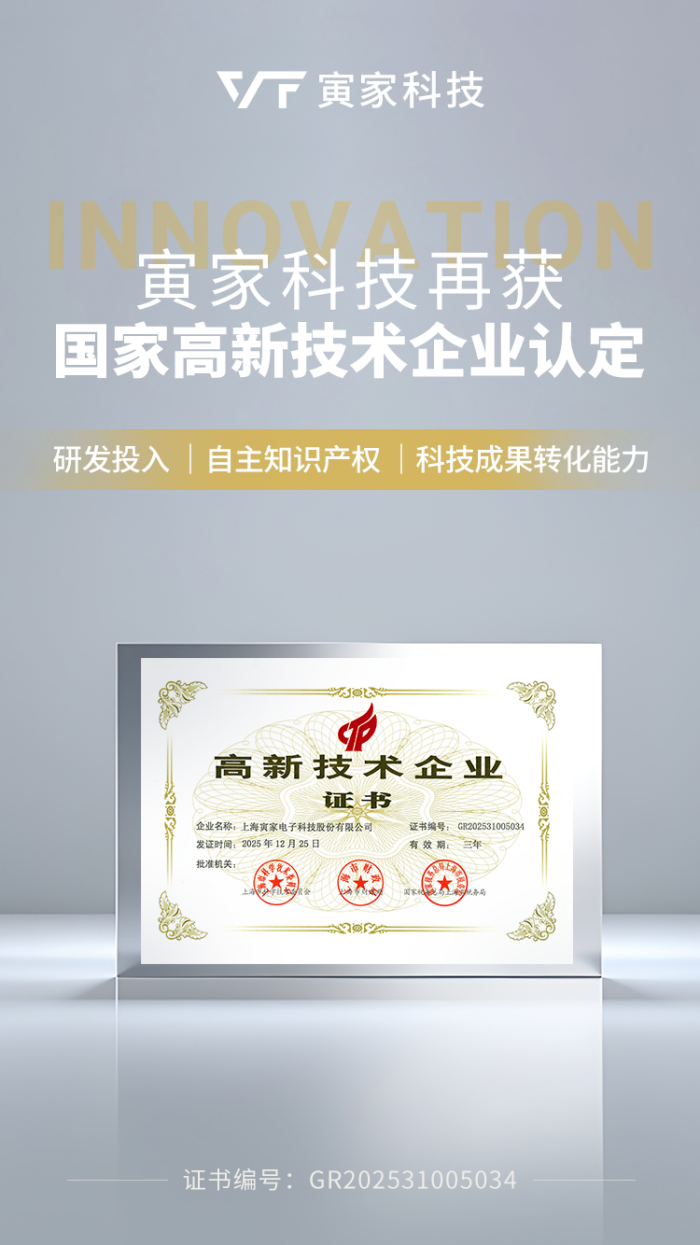 上海寅家电子科技股份有限公司(以下简称 “寅家科技”)正式通过国家高新技术企业复审,再次荣获由上海市科学技术委员会、上海市财政局、国家税务总局上海市税务局联合颁发的《高新技术企业证书》(证书编号:GR202531005034)。