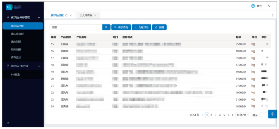 通过自主管理数据收集,利用飞书多维表格系统,建立数字化管理模块,对化学品的出入库进行实时跟踪,落实到出入库经手人、数量、化学品添加取向等信息进行收集分析。依据车间生产计划对化学品的库存进行预警,自动生成采购清单。另外,我们还将化学品检测数据上传系统,利用系统AI程序分析化学品检查值变化趋势,及时反馈预警信息,方便决策调整化学品状态。
